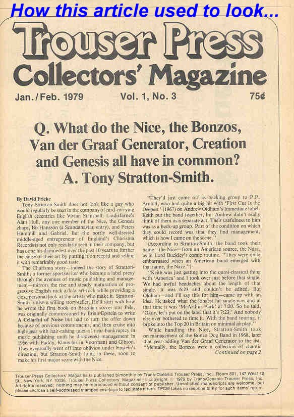 Needless to say, handling as unstable a stable of artists as the Nice, Bonzos, Van der Graaf, and the Creation gave Tony Stratton Smith record company headaches he didn't need. However, these aches and pains were not the cause of the artists but of the labels themselves. According to Stratton Smith, Oldham's Immediate label did no great favors for the Nice -- during the filming of an NBC-TV special in California, The Nice could not get Immediate's New York office on he phone because it was on an answering service for a week. United Artists in the States was particularly uncaring about the Bonzos and, as for Mercury's early contract with Van der Graaf, they gave the band a full two days to record [their debut album,] Aerosol Gray Machine. "And even then," says Stratton Smith with a visible display of sarcasm, "they thought they were doing us a favor. It was probably two days Rod Stewart didn't use." (Stratton Smith also had troubles with English Decca when he got Al Stewart - whom he managed for a time -- into the studio to record his first single, The EIf b/w the Yardbirds' Turn to Earth.)
